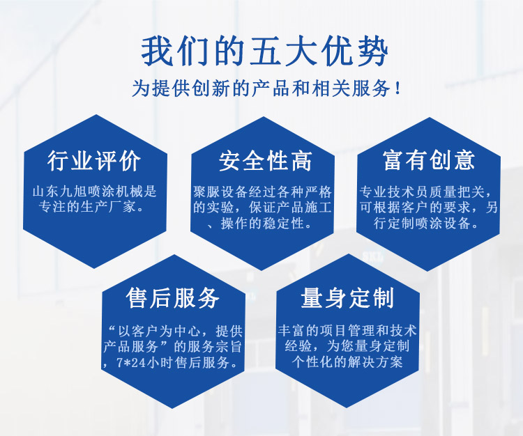 目前山東九旭機(jī)械設(shè)備已領(lǐng)跑中國(guó)液壓聚脲設(shè)備行業(yè),價(jià)格合理成為廣大客戶之首選。液壓聚脲噴涂機(jī)廠家所銷(xiāo)售產(chǎn)品主要來(lái)自國(guó)內(nèi)及國(guó)際知名品牌,產(chǎn)品性能優(yōu)良,價(jià)格合理,專(zhuān)業(yè)的技術(shù)和完善的售后服務(wù)贏得國(guó)內(nèi)外眾多客戶的誠(chéng)摯贊賞........
